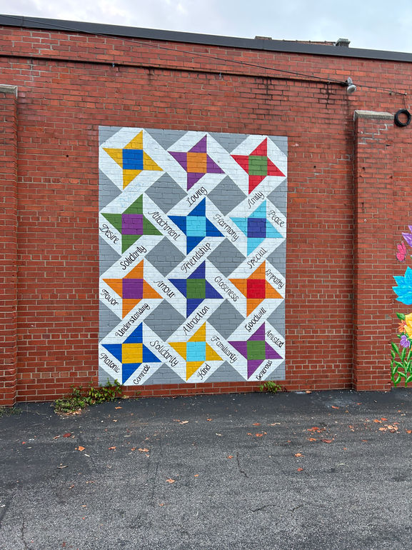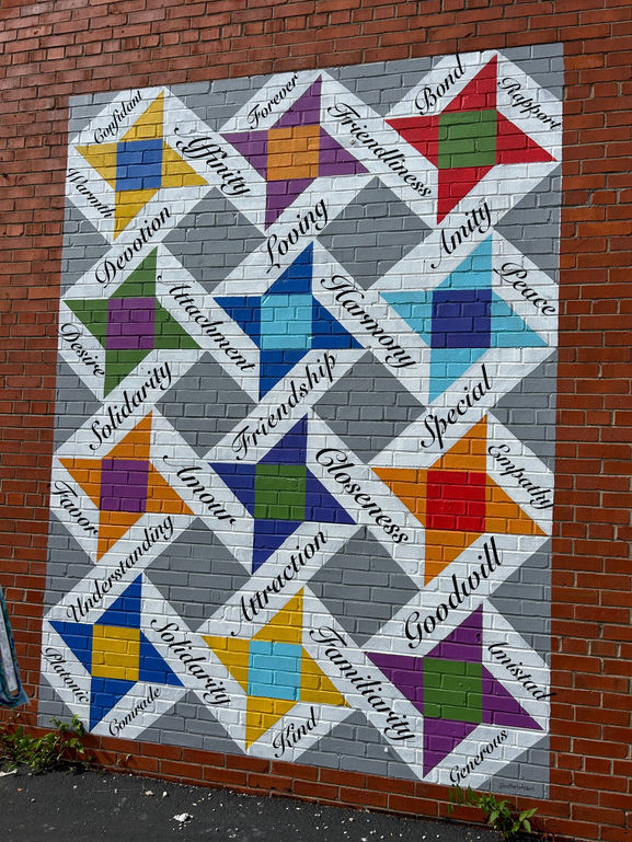 So, I completely covered up and extended the original flowers, replacing the dull colors with bright, eye-catching shades of blue, yellow, and purple. The preexisting quilt was a friendship quilt. 30 different words that encompass the meaning of friendship were added. A new photo spot on Main Street was created, bringing more attention to Birdsong Quilting!