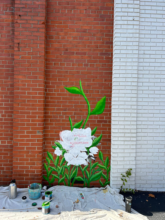 Shannon Burns at Birdsong Quilting approached me requesting new artwork to cover up a preexisting mural from another artist. She was hoping for something that highlighted her passion for both gardening and quilting. When originally painted, Shannon did not feel at all satisfied with the outcome of the flowers, specifically, and wanted the whole thing to be more vibrant and noticeable.